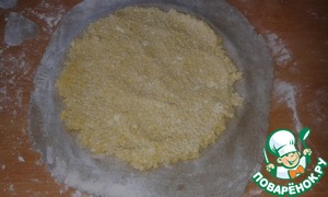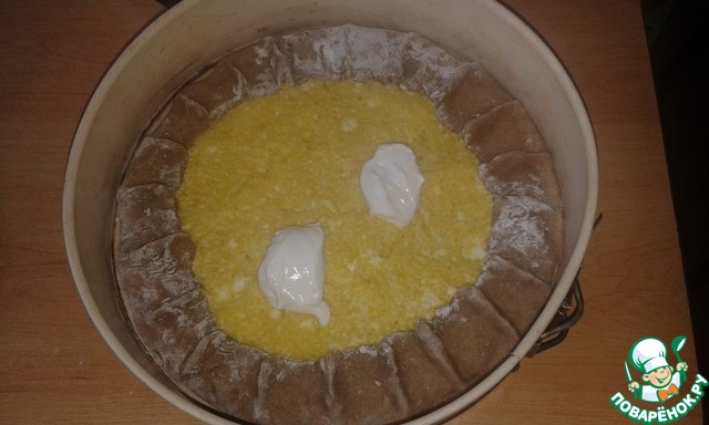 Замесить не очень крутое тесто. Для начинки смешать предварительную сваренную кукурузную крупу, творог и яйцо