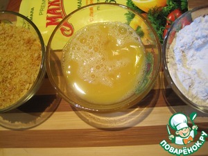 Для панировки возьмём три мисочки. В первую насыплем муку, во второй немного взобьём два яйца, в третью насыплем панировочные сухари или хлебные крошки. Я использую панировочную смесь, которую заранее приготовила сама.