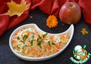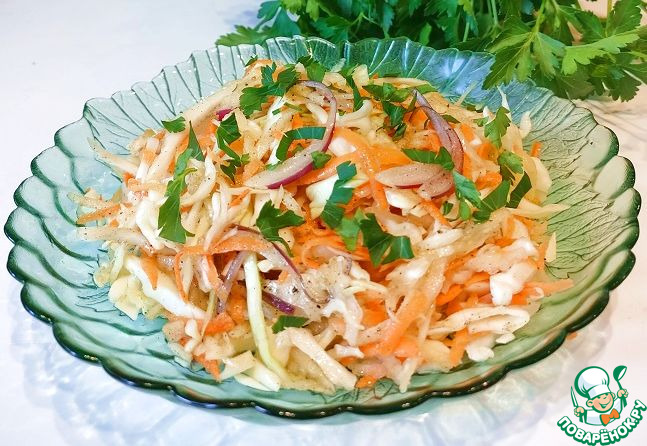 Лук порезать полукольцами, добавить его и яблоко к овощам. Аккуратно перемешать. Добавить мелко порезанную петрушку.