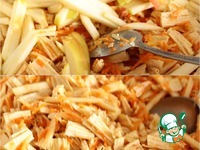 Морковь нашинковать тонкой соломкой или натереть на специальной терке для корейских салатов. Положить в глубокую миску, мешать руками, пока морковь не даст сок 2-3 минуты. |