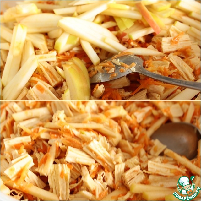 Добавить яблоко в салат. Оставить настаиваться на 1-2 часа. Затем еще раз перемешать и подавать к столу. |