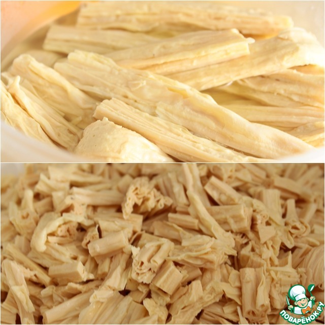 Соединить морковь с фучжу, залить готовым соусом (заправка для спаржи по-корейски). Перемешать. |