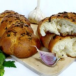 Тем временем разогреваем духовку. В оставшееся масло добавляем измельченный чеснок и петрушку. Из подошедшего теста сначала формируем 4 жгута и скручиваем их попарно в плетенку. Смазываем каждую ароматной смесью, даем еще немного подойти и отправляем в духовку на минут на 30 при 180 градусах.