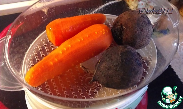 Для приготовления этого блюда свеклу необходимо сварить. Я это сделала в пароварке. (Морковь у меня сварена для другого блюда). Свеклу охладить.