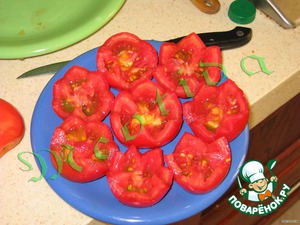 Помидоры помыть, обсушить, горизонтально отрезать немного помидора с двух сторон, для устойчивости цветочков. С помощью ножа вырезать из каждого помидора по два цветочка-корзиночки, прорезая помидор по экватору зубчиками.