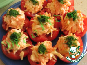 Яблочко, сыр, морковь, немного чеснока и майонеза в серединке цветочка из помидора.. сверху немножко укропчика..