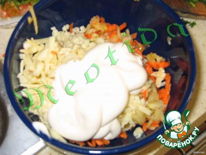 Морковь (почищенную от кожуры), яблоко (почищенное от сердцевины) и сыр на тереть на крупной терке. Добавить измельченный чеснок и майонез, все хорошо размешать,