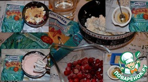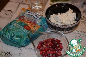 Пока тесто готовится, приготовим все для начинки. Это- творог, ягоды (у меня сегодня замороженная смородина и клюква), сахар и воду. Если Вы совсем-совсем боитесь за свою фигуру, сахар можно заменить сахарозаменителем по вкусу.