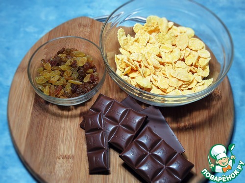 4. Теперь добавим в шоколад хлопья с изюмом и хорошенько перемешаем.