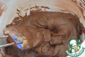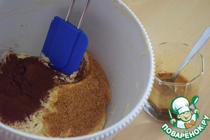 К остальному тесту добавить 35 г сахара, какао и растворённый в молоке кофе. -