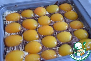 Теперь сверху на тесто выкладываем абрикосы, слегка прижимая их в тесто.