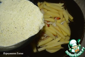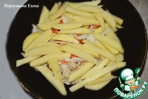 Выложить картофель поверх мяса с овощами и