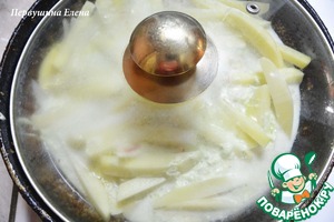 тушить под закрытой крышкой до полуготовности картофеля.