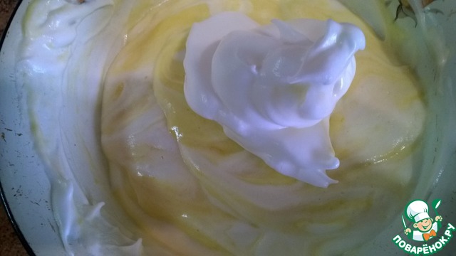 1\3 взбитых белков вводим в желтки, постепенно, аккуратно перемешиваем снизу вверх по часовой стрелке.