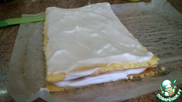 Вынимаем готовый бисквит, обрезаем края, и делим на две части- одна будет поверх другой. Смазываем первый слой остатками взбитых белков, покрываем вторым слоем бисквита, снова смазываем белками. Помните мы края срезали? Так вот они пригодятся для присыпки. Измельчаем их и посыпаем сверху.