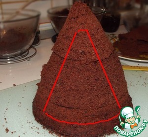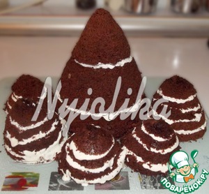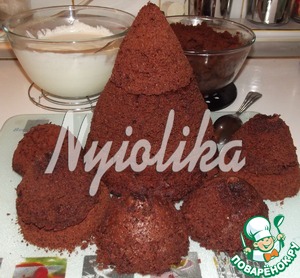 Смазываем кремом пирожные, и внутреннюю часть центральной горы. Часть крема отделяем для вершин (грамм 150) остальное смешиваем с измельченными обрезками коржей.