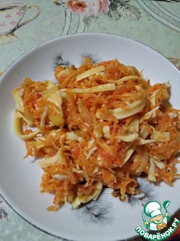 Морковь помыть, очистить и натереть на средней терке. Отварные яйца также натереть. Добавить в салатник мелко нашинкованный лук, и сыр натертый на средней терке