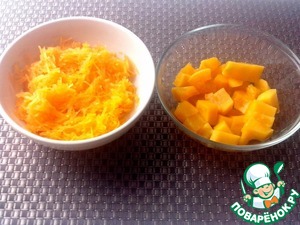 Половину сырой тыквы натереть на средней (или мелкой) терке и отставить в сторону. Вторую половину нужно запечь в духовке или микроволновке. Я запекала в микроволновке 2 мин (мощность 750 W). Тыква не должна быть слишком мягкой, она должна сохранять при нарезке форму. Остудить тыкву и нарезать небольшими кубиками.