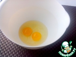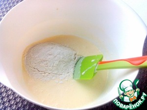 Добавить к взбитой смеси просеянную муку с разрыхлителем, перемешать до однородного состояния лопаткой или ложкой. Тесто получается, как густая сметана.