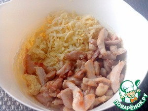 Добавить к тесту 50 г натертого сыра (20 г сыра понадобится позже) и кусочки куриного филе. Перемешать.