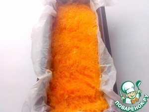 Форму (у меня тефлоновая 29*10) выстелить бумагой для выпечки, смазать маслом, выложить тесто и разровнять его поверхность.