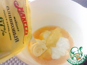 К яйцам добавить размягченное сливочное масло, сметану и майонез ( я использовала оливковый майонез ТМ "Махеев"). Взбить миксером еще раз.