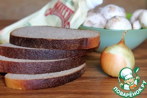 Хлеб (лучше брать уже нарезанный) обжарить на сухой сковороде (или смазать ее слегка маслом) до хрустящей румяной корочки и еще горячими хорошенько натереть чесноком. Лук почистить и нарезать полукольцами, шампиньоны тоже почистить и нарезать пластинками.