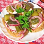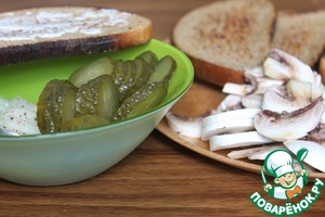 Замариновать лук в уксусе и сахаре, можно посыпать молотым перцем минут на 5-10. Тем временем каждую гренку слегка смазать майонезом и нарезать тонкими кружочками соленый огурец.