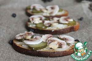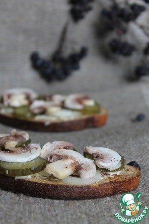 Можно приступать к сборке бутерброда. На хлеб, смазанный майонезом, выкладываем маринованный лук, сверху - огурец и пластинки грибов. Если хотите, можете еще и сверху сделать тонкую сетку из майонеза, но я просто посыпала смесью молотых перцев.