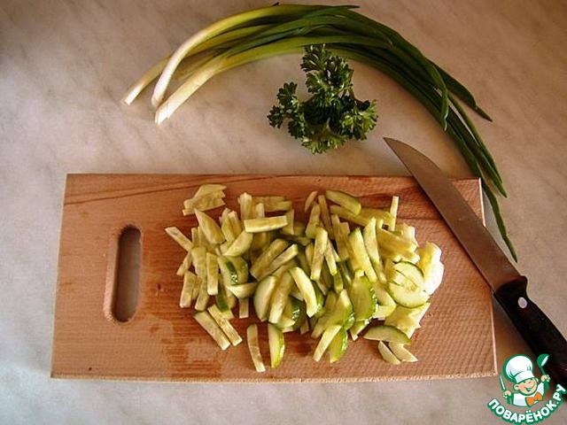 Яблоко очищаем от кожуры и освобождаем от косточек. Нарезаем такой же соломкой, как и огурец. Не забываем сбрызнуть несколькими каплями лимонного сока, чтобы не потемнело! |