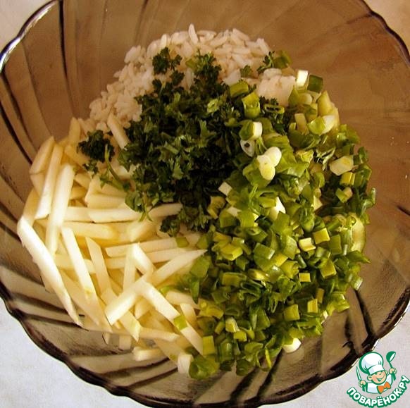 Измельчаем петрушку и зеленый лук. Отправляем все в большую миску к заранее отваренному рису. Солим и перчим по вкусу. |