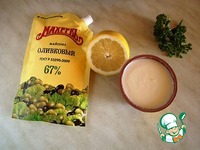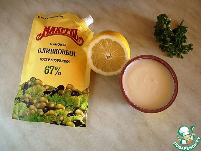 Приготовим соус из майонеза, йогурта и 2 ст. л. лимонного сока. Хорошо перемешаем соус и заправим наш салат. |