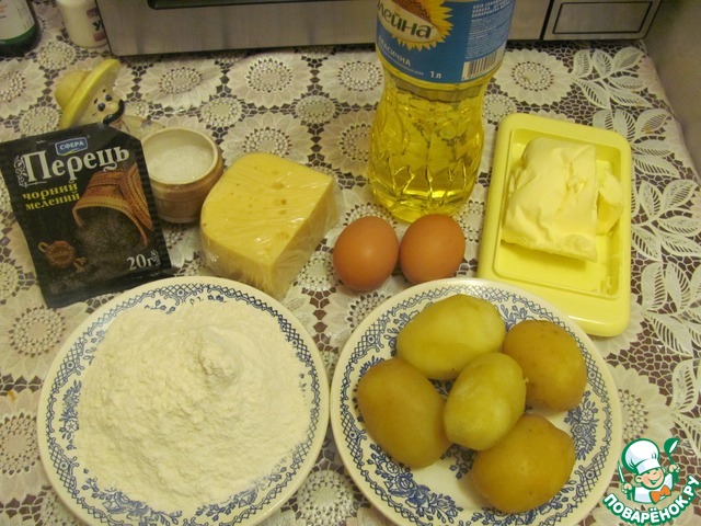 Картофель измельчаем на мелкой терке (как у меня) или в блендере. Добавляем яйца, соль, перец, половину размягченного масла, половину тертого сыра. Замешиваем своеобразное тесто, добавляя необходимое количество муки. Масса должна получиться не слишком тугой, но чтобы держала форму. В среднем, на такое количество ингредиентов нужно до 6 ст. л. муки.