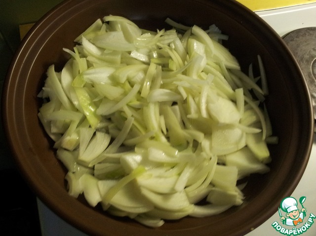 Лук нарезаем полукольцами, прогреваем в тажине минимум полчаса на среднем огне