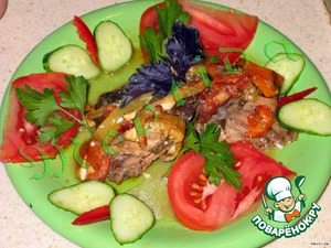 Нежнейшие куриные грудки.. перец, морковь, помидор, чеснок, лук, специи и травки.. с заправкой из красного вина и лимонного сока..
