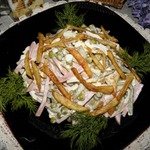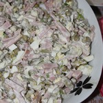 Предлагаю вашему вниманию салат с ветчиной и маринованными огурчиками. Это, так сказать, своеобразный вариант на привычный нам салат "Оливье". Готовьте с удовольствием. ))