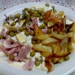 Я бы предложил такой процесс изготовления. Сначала режем в миску ветчину, огурцы, лук четверть кольцами, ошпариваем его. Добавляем горошек. И все оставляем постоять. Пока стоят лук напитается маринадом из огурца, лук вообще любит в себя впитывать и принимать вкус разных составляющих, находящихся по соседству. За это время отвариваем яйца и жарим картофель. Картофель откладываем отдельно, а все остальное смешиваем, с майонезом, даем постоять не меньше часа в холодильнике перед подачей, что бы все ингредиенты остыли и салат приобрел ровный приятный вкус и равную температуру составляющих. Перед подачей добавляем картофель сверху.