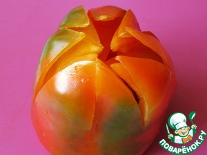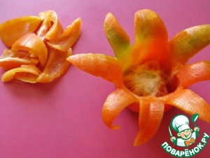Достаём из воды раскрывшийся перец, ножом аккуратно срезаем мякоть, которую мы отделяли от листиков, также аккуратно очищаем "чашечку" от семян и внутренних перегородок и можно наполнять наш перчик-цветок салатом.