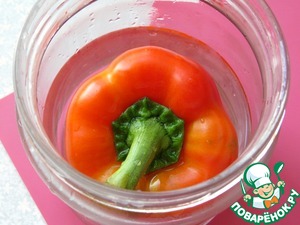 Далее перец погружаем в очень холодную воду на 1-2часа. Чем холоднее вода, тем быстрее листики раскроются. Я поместила перец в банку, но когда листики начали раскрываться мне пришлось переложить его в широкую посуду.