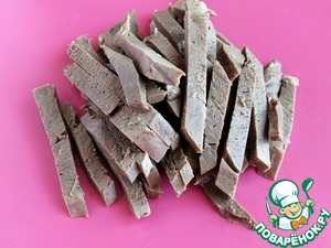 Свиное сердце отвариваем в воде 1-1,5часа, за пол часа до окончания варки солим и кладём лавровый лист. Готовое сердце остужаем и нарезаем соломкой. -