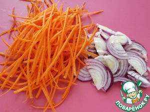 Морковь трём кому как вздумается, лук нарезаем соломкой и вместе с морковью обжариваем на растительном масле до мягкости.