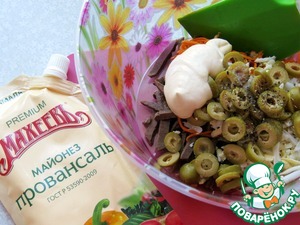 Ко всем ингредиентам добавляем майонез, смесь перцев и соль (соль аккуратно, майонез и оливки солёные). Всё хорошо перемешиваем.