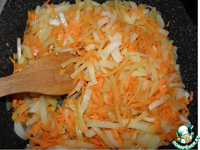 Слегка обжарить лук и морковь на растительном масле. ( специи по вкусу)