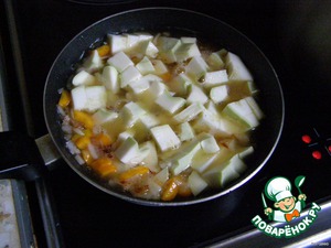 Патиссон нарезать кубиками, добавить к овощам. Туда же влить половину бульона и потушить. Стебли сельдерея добавить в сковороду. Листики мелко порубить.