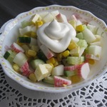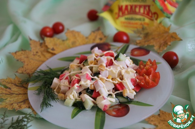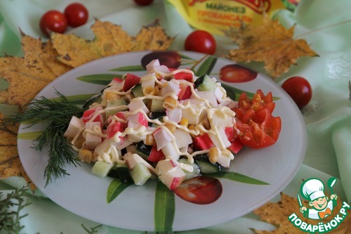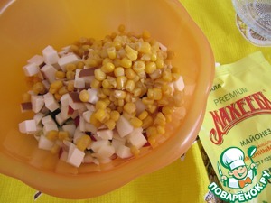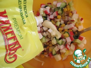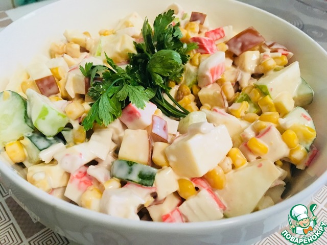 Искала рецепт крабового салата без яиц, - наткнулась на этот, - колбасный сыр заменила твердым сыром, нарезка средний кубик. Заправила майонезом, попробовала, - чего то мне не хватало) добавила немного французской горчицы и все встало на свои места). Сочный, легкий, сытный салат.