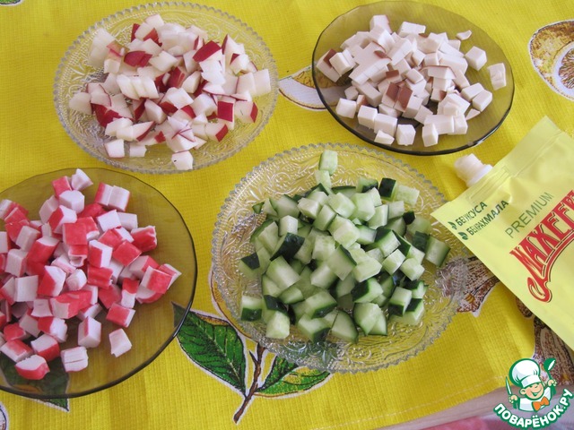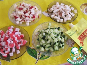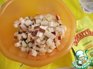 • Крабовые палочки, огурец, яблоко и сыр нарежьте кубиками