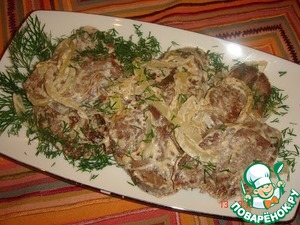 Лук нарезать полукольцами, обжарить и переложить в сковороду к языку. Добавить сливки или домашнюю сметану, соль, перец, прогреть пару минут.