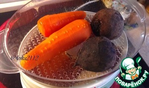 Морковь отварить, охладить и очистить. Так как я варила морковь на пару и чистить её отварную не люблю, то вначале я морковь очистила, а потом сварила в пароварке. (Свекла готовилась для "Вари гуцульской", в состав этого блюда она не входит).