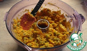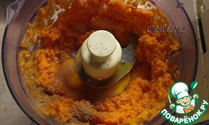 Отварную морковь измельчаем кухонным процессором, блендером или вилкой. У меня трудился "старичок процессор" :-) К измельчённой моркови добавляем яйца, молоко, мускатный орех, соль и всё тщательно перемешиваем.