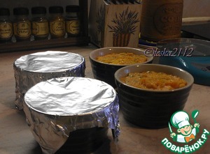 Теперь берём фольгу, разрываем её на кусочки и накрываем формочки с суфле сверху. Ставим в разогретую до 180*С духовку на 30 минут.